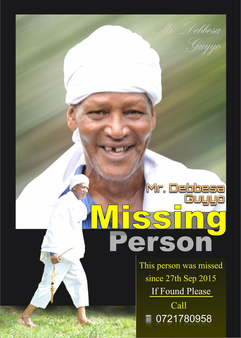Abbaa Liiban Dabbasaa Guyyoo was disappeared on September 27, 2015 after he returned from the Irreechaa holiday celebration in Nairobi, Kenya. Despite the efforts to locate his whereabouts, Abbaa Liiban Dabbasaa Guyyoo is missing until now.