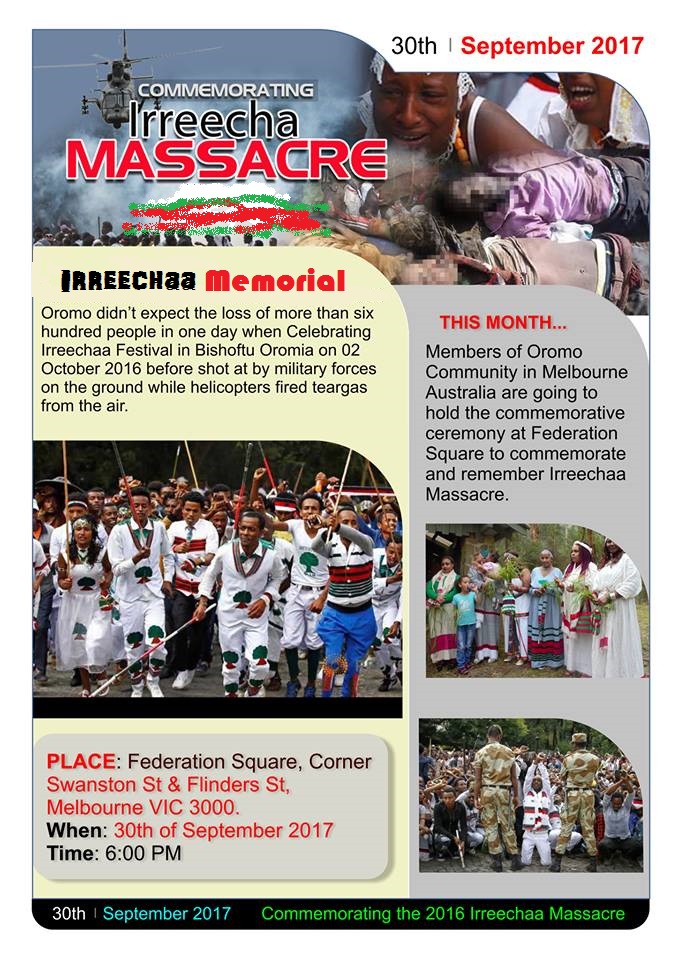 Members of Oromo Community in Melbourne Australia are going to hold the commemorative ceremony at Federation Square to commemorate and remember Irreechaa Massacre.