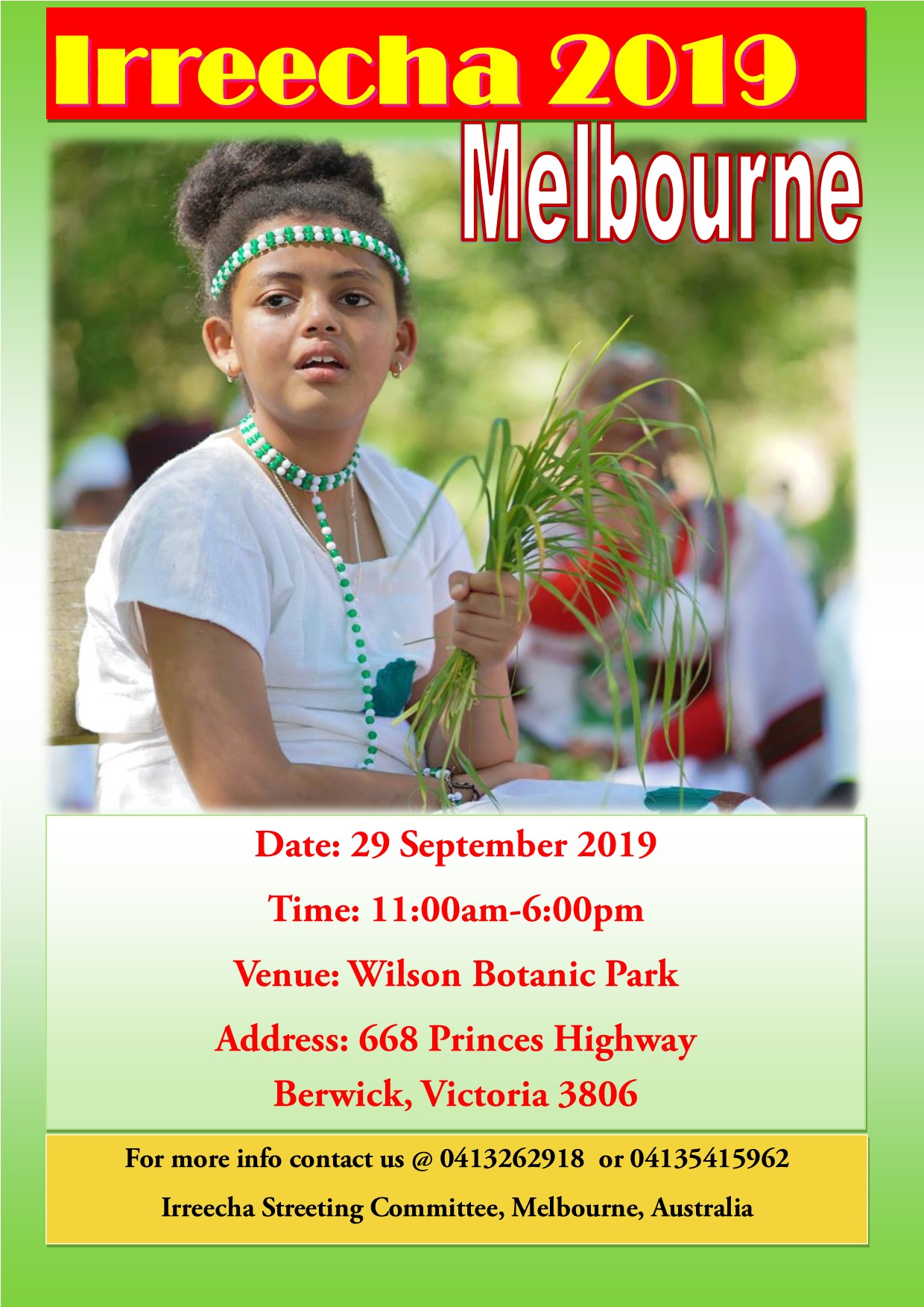 (Melbourne, Irreechaa, September 20, 2019)-The Oromia Irreechaa Organising Committee in Victoria is preparing to celebrate Irreechaa in Melbourne on 29th September.