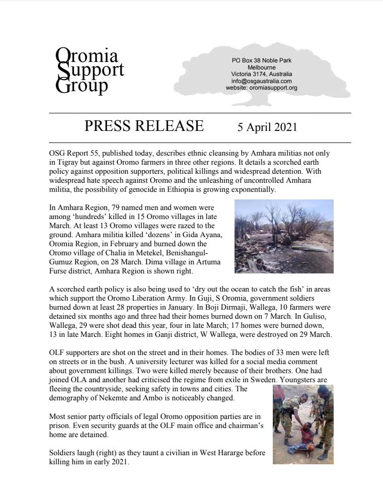 Oromia Support Group (OSG) report 55 and press release – 5 April 2021