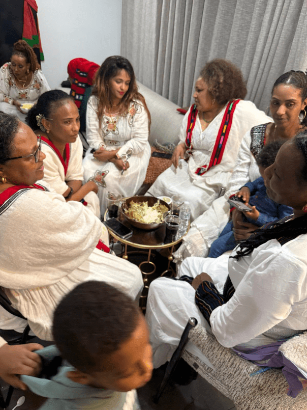 The ritual reinforces Oromo cultural identity and continuity, serving as a way to preserve and pass down these traditions to younger generations. During the ceremony, mothers dressed in traditional clothes surrounded the mother and expressed their happiness; sitting around the midwife after eating the marqaa, they blessed the new mother, ‘give birth again; carry it on your shoulder and back; be strong in your knees.’
