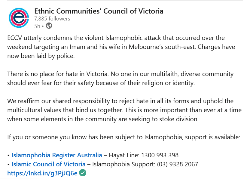 MELBOURNE, VIC – The Ethnic Communities’ Council of Victoria (ECCV) has issued a strong condemnation following a violent Islamophobic attack over the weekend that targeted an Imam and his wife in Melbourne’s south-eastern suburbs. Victoria Police have confirmed that charges have now been laid in connection with the incident.