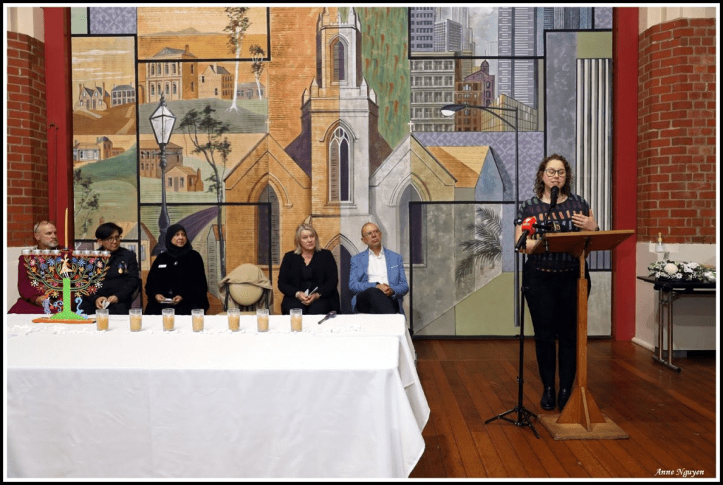 In one of the vigil’s most poignant moments, fifteen candles—provided by the Jewish Museum of Victoria—were lit by multicultural community leaders. Each flame represented a life lost in Sydney, a silent, glowing tribute to the victims. Following the lighting, Rabbi Ralph Genende OAM offered a moving memorial prayer, filling the hall with a spirit of remembrance and solace.