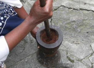 Roasting coffee_zThe Oromo coffee is brewed by first roasting the green coffee beans over hot coals in a brazier. Once the beans are roasted each participant is given an opportunity to sample the aromatic smoke by wafting it towards them. This is followed by the grinding of the beans, traditionally in a wooden mortar and pestle. The coffee grounds are then put into a special vessel and boiled. The boiling pot (jabanaa) is usually made of pottery and has a spherical base, a neck and pouring spout, and a handle where the neck connects with the base. When the coffee boils up through the neck it is poured in and out of another container to cool it, and then is put back into the boiling pot until it happens again. To pour the coffee from the boiling pot, a filter made from horsehair or other material is placed in the spout of the boiling pot to prevent the grounds from escaping.